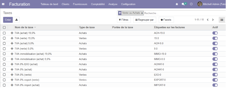 De cette façon vous accédez à une liste de taxes déjà configurées, cliquez sur créer pour créer une nouvelle taxe.